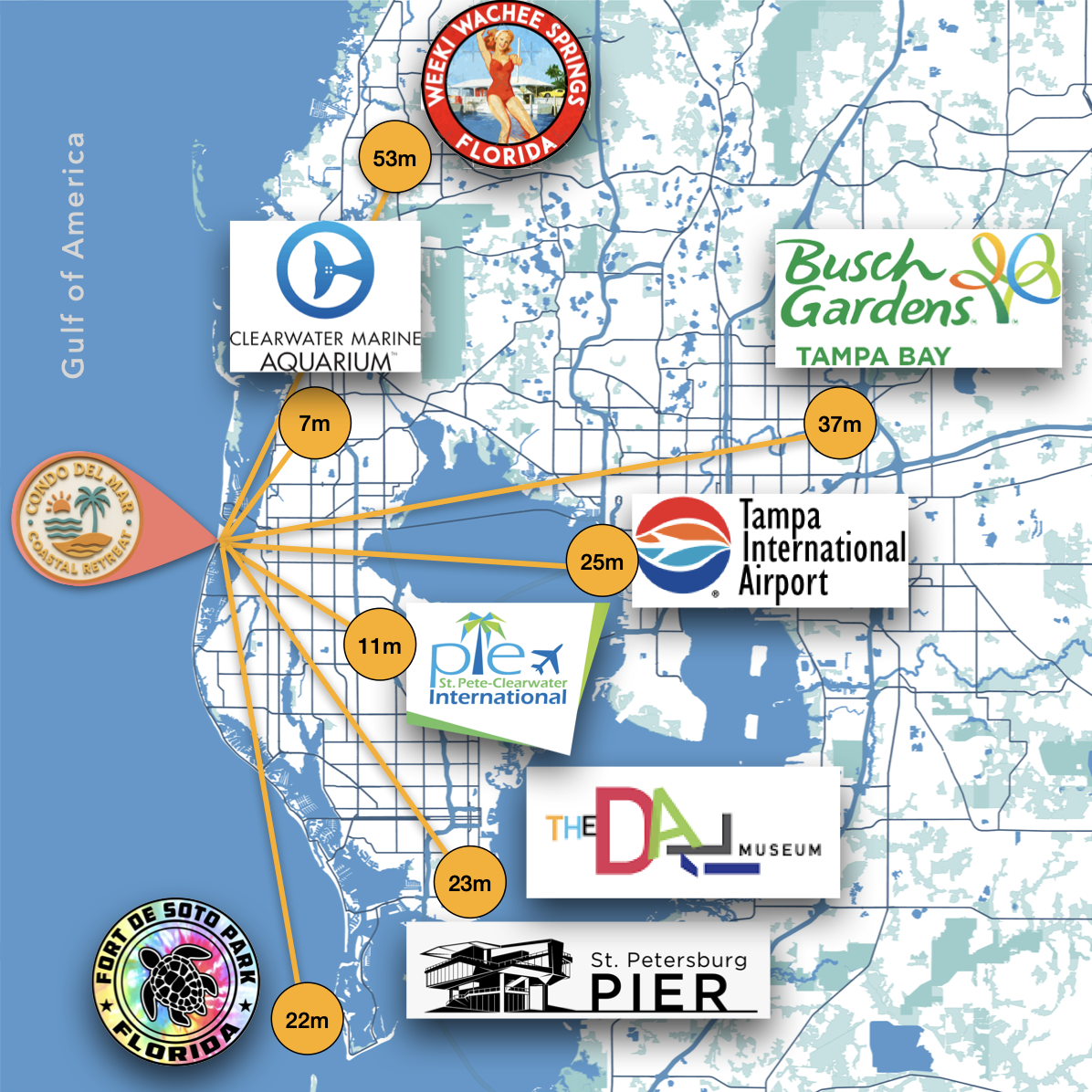 Condo Del Mar sits in the center of Florida’s Gulf Coast, placing many of the region’s top attractions within an easy drive. Guests can explore Clearwater, St. Petersburg, and Tampa during the day while returning to the quieter charm of Indian Rocks Beach in the evening.